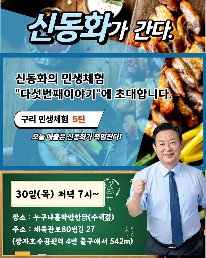 [구리=로컬라이프] 송준형 기자 = 신동화 구리시의회 의장은 29일, 자신의 페이스북을 통해 신동화가 간다. 신동화의 민생체험(일일아르바이트) "다섯번째 이야기"에 초대한다고 밝혔다.
