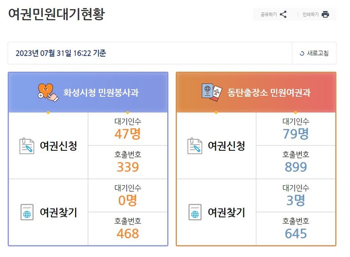 화성시청 홈페이지 메인화면 또는 민원 여권 발급 탭에 접속하면, 여권 발급 신청 및 수령 실시간 대기인 수와 호출 번호를 현장 방문 전에 미리 조회할 수 있다.
