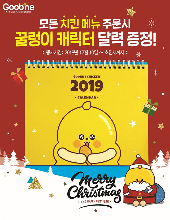 오븐구이 치킨 프랜차이즈 굽네치킨(대표 홍경호)이 치킨을 주문하면 ‘2019 꿀렁이 캐릭터 달력’ 증정 행사를 진행한다고 10일 밝혔다.
