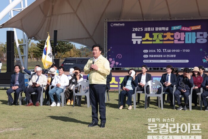 | ▲ 임병택 시흥시장이 ‘2025 시흥시 장애 학생 뉴스포츠 한마당’ 행사에 참석해 축사를 하고 있다. (사진출처=임병택 페이스북) |