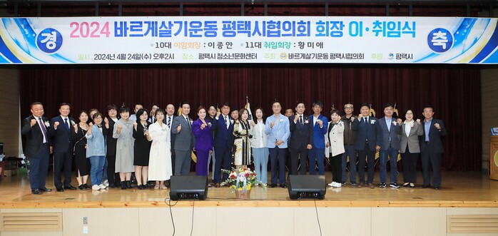 바르게살기운동 평택시협의회(이임회장: 이종안, 취임회장: 황미애)는 지난 24일 평택시 청소년문화센터에서 ‘바르게살기운동 평택시협의회 제10대·제11대 회장 이취임식’을 개최했다고 밝혔다.