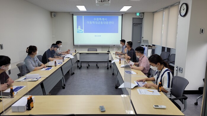사진/ 23일 수원시 아동학대 공동대응센터에서 진행된 간담회에 수원시 보육아동과, 부천시 아동청소년과 공직자들이 참여하고 있다.(사진제공=수원시)