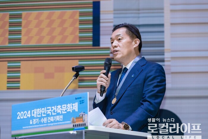 | ▲ 이재준 수원특례시장이 ‘2024 대한민국건축문화제&경기·수원건축기획전’ 개막식에 참석해 축사를 하고 있다. (사진출처=이재준 페이스북) |