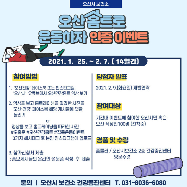 고동훈 오산시 보건소장은 “코로나19로 힘든 상황이지만 시민들의 건강을 위해 이번 이벤트를 계획했다.”며 “시민들도 집에서 운동을 통해 코로나19를 함께 이겨냈으면 좋겠다.”고 말했다.