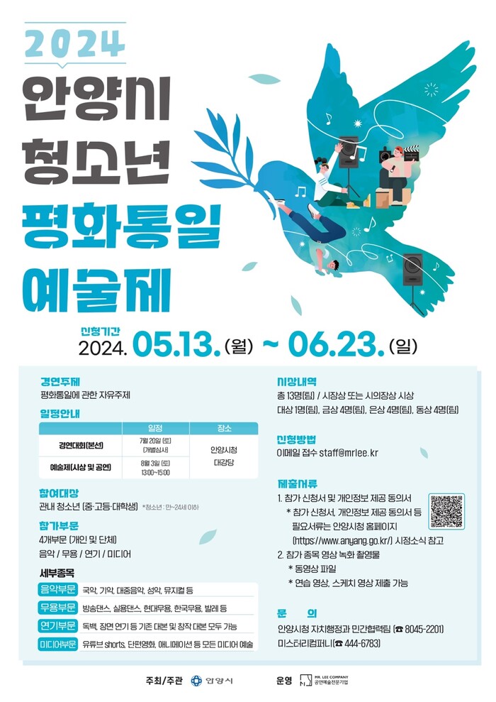 안양시는 오는 8월 3일 개최되는 ‘2024년 청소년 평화통일 예술제’에 참가할 참가자를 모집한다고 10일 밝혔다.