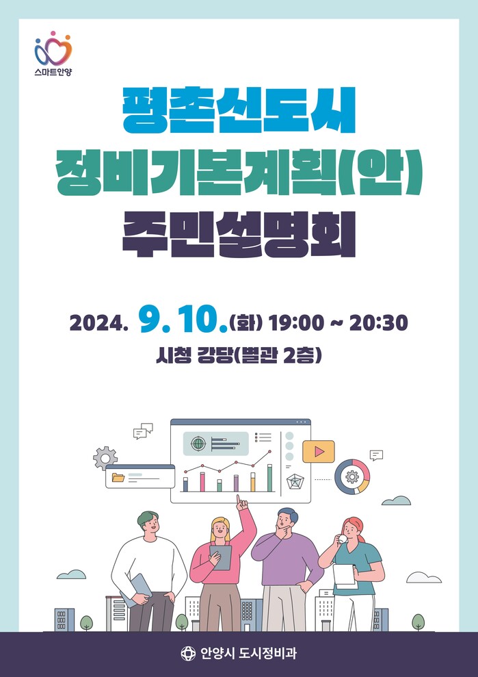 안양시는 오는 10일 오후 7시부터 8시30분까지 안양시청 별관 2층 강당에서 ‘평촌신도시 정비기본계획(안) 주민설명회’를 개최한다고 5일 밝혔다.