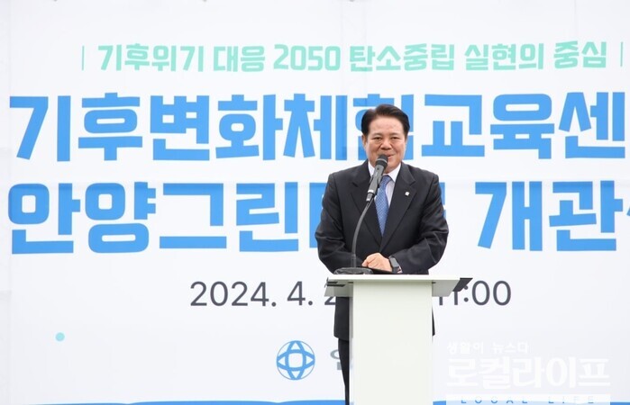 | ▲ 최대호 안양시장이 “기후변화체험교육센터 ‘안양그린마루’ 개관식”에 참석해 축사를 하고 있다. (사진출처=최대호 페이스북) |