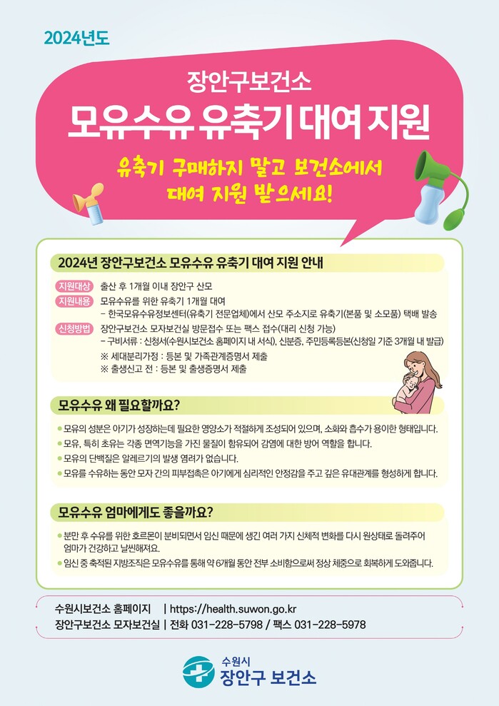 수원시 관계자는 “전동 유축기를 대여가 모유 수유 환경을 조성하는 데 도움이 되길 바란다”고 밝혔다.