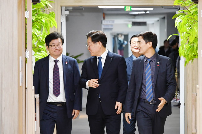 <사진/ 2019년 12월23일 수원시-화성시간 경계조정 협약식에서 염태영 수원시장(왼쪽)과 이재명 경기도지사(가운데), 서철모 화성시장(오른쪽)이 화기애애한 분위기로 대화를 나누고 있다.>