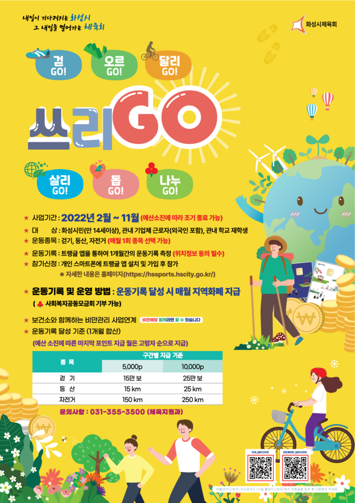 ‘쓰리GO’는 걷기, 자전거타기, 등산 중 한 가지 종목을 선택해 목표를 달성하면 5천에서 1만 포인트를 지급하는 사업이다.