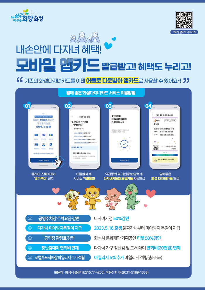 정명근 화성시장은 “모바일카드 발급제도 도입을 통해 다자녀카드 발급 절차를 신속하고 편리하게 개선했다”며, “저출생 사회문제에 대한 다양하고 실질적인 출산·양육 정책을 추진해 아이키우기 좋은 화성시를 만들어 나갈 것”이라고 밝혔다.