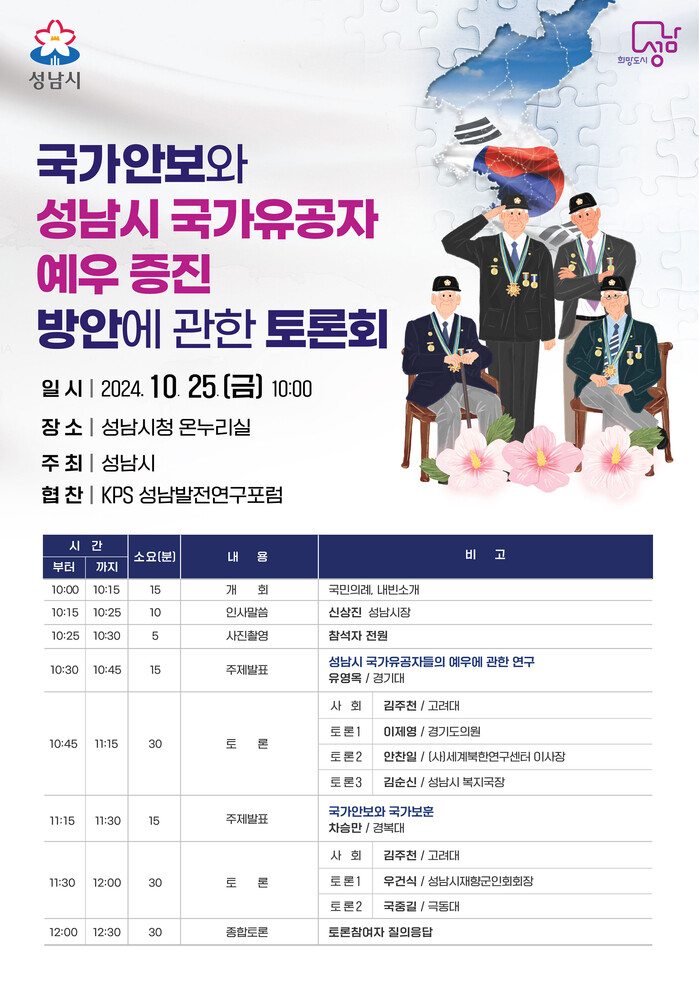 성남시는 오는 10월 25일 오전 10시 시청 1층 온누리에서 500여 명이 참석한 가운데 ‘국가안보 및 국가유공자 예우 증진 방안에 관한 정책 토론회’를 개최한다.