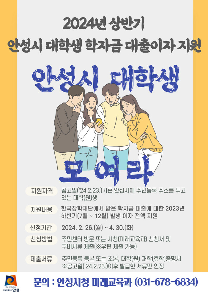 안성시는 2월 26일(월)부터 4월 30일(화)까지 ‘2024년도 상반기 안성시 대학생 학자금 대출이자’ 지원 신청을 받는다.