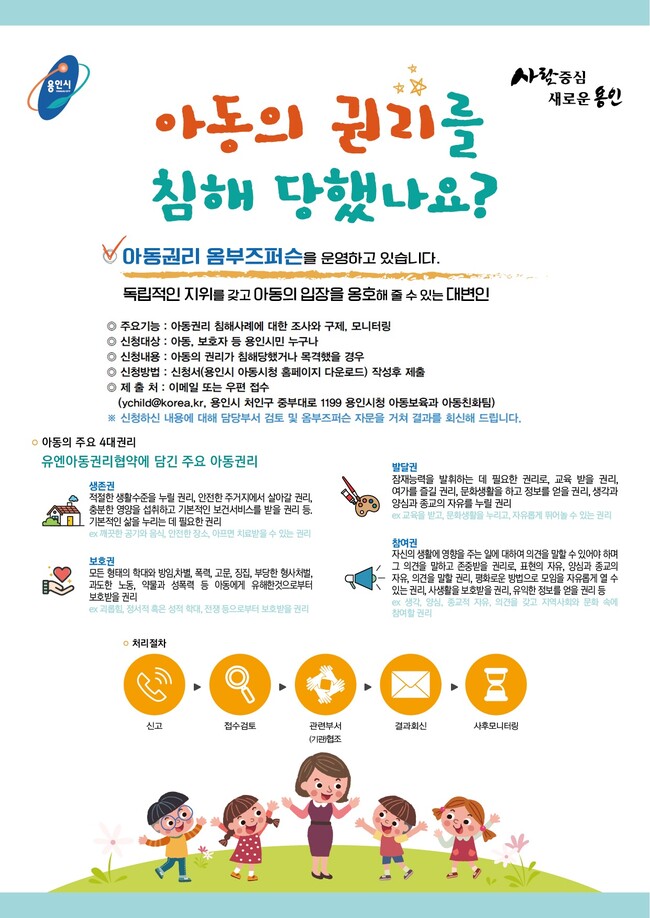 한편 아동권리는 유엔아동권리협약에 담긴 아동의 ‘생존권’, ‘발달권’, ‘보호권’, ‘참여권’ 등 총 4가지 권리를 말한다. 시는 아동권리에 대한 이해를 돕기 위해‘아동권리 홍보 동영상’을 제작해 지난 17일 용인시 공식 유튜브 채널에 게시하는 등 시민 인식 개선과 아동권리 증진을 위해 노력하고 있다.