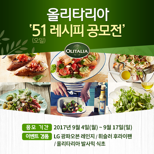 이번 이벤트는 다양한 요리의 풍미를 돋구어 주는 각양각색의 올리타리아 제품을 널리 알리고자 오일에서 착안한 ‘51개 레시피’를 선보이고, 소비자들의 다양한 레시피를 발굴하고자 특별히 준비된 이벤트다.