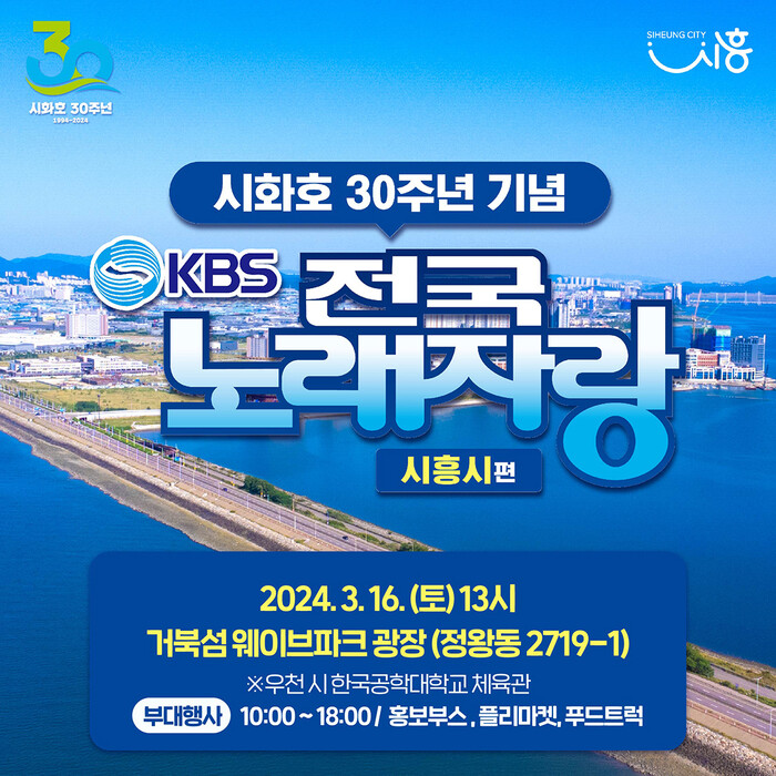 시흥시(시장 임병택)는 3월 16일 오후 1시에 거북섬 웨이브파크 광장에서 시화호 30주년 기념 KBS 전국노래자랑을 개최한다고 밝혔다.