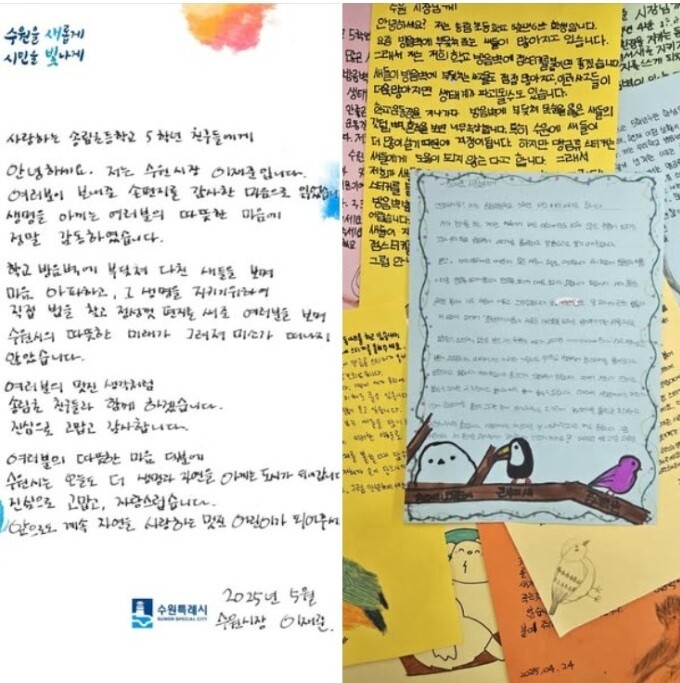 아울러 "생명을 아끼는 아이들의 따뜻한 마음이, 법령까지 언급하며 당당히 요구하는 총명함이, 이리 대견할 수 없다"며 "귀한 마음을 먼저 받았으니, 저도 진심을 담아 손편지 답장을 보내본다. 사랑하는 송림초등학교 5학년 친구들! 더 이상 새들이 다치지 않도록 기꺼이 돕겠다. 여러분 덕분에 수원시는 오늘도 생명과 자연을 아끼는 도시가 되어간다. 여러분이 진심으로 자랑스럽다"고 밝혔다.