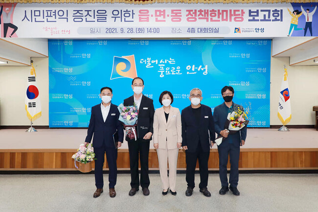 보고회 직후 평가점수를 집계하여 우수 정책을 선발한 결과, 최우수에 안성2동, 우수에 안성1동, 장려에 양성면과 삼죽면이 선정되었으며, 각각 200만원, 150만원, 100만원의 시상금도 전달되어 그동안 보고회 준비로 애쓴 읍·면·동 직원들의 노고를 치하했다.
