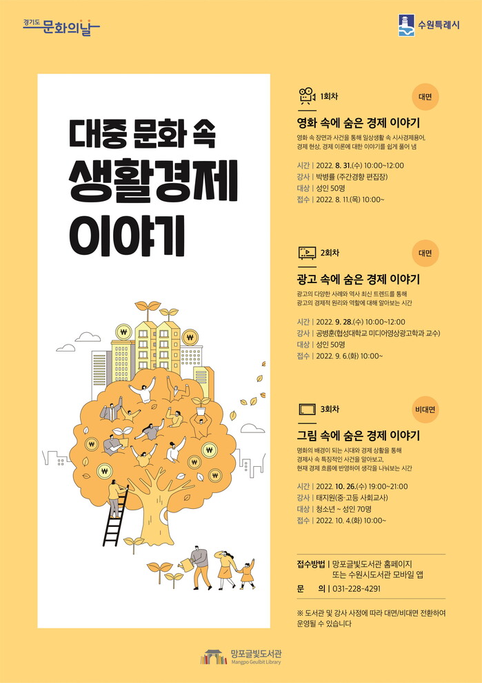 수원시망포글빛도서관 홈페이지(https://www.suwonlib.go.kr/mpgb)에서 ‘통합예약/신청→독서문화프로그램→[경기도 문화의 날] 대중문화 속 생활 경제 이야기3 : 그림 속에 숨은 경제 이야기’를 클릭해 신청하면 된다.