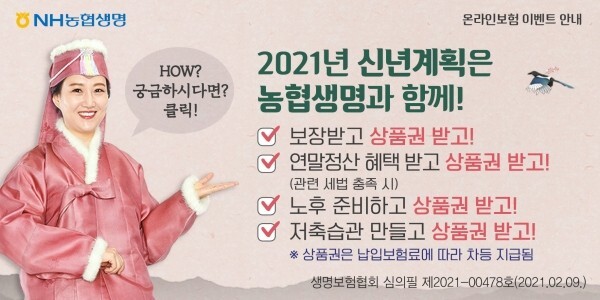 NH농협생명은 다음달 3월 31일까지 ‘온라인보험’을 가입한 고객에게 농촌사랑상품권 또는 NH포인트를 증정하는 이벤트를 실시한다고 밝혔다.