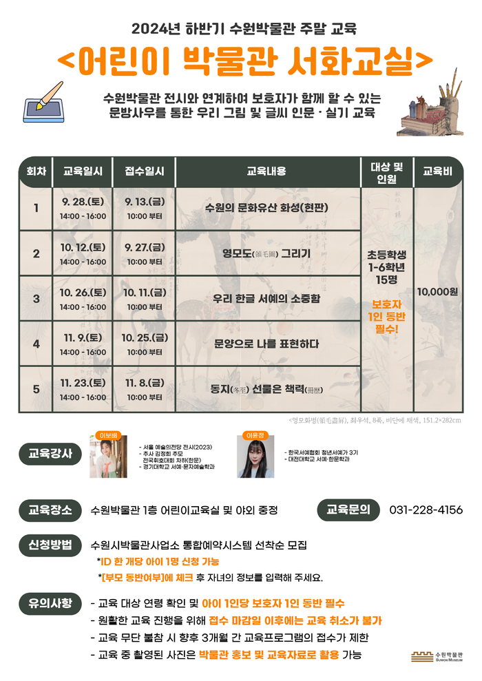 수원박물관이 2024년 하반기 주말 교육 프로그램인 ‘어린이 박물관 서화교실’에 참여할 초등학생·가족을 모집한다.