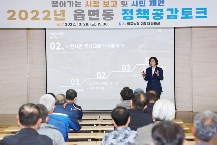 이날 정책공감토크 행사는 일죽면 주민자치센터 노래교실의 식전공연을 시작으로, 김보라 안성시장의 8대 핵심공약 시정 보고, 지난해 정책공감토크 건의사항에 대한 진행경과 보고 및 향후계획 설명, 지역 현안에 대한 주민 의견수렴 순으로 진행됐다.