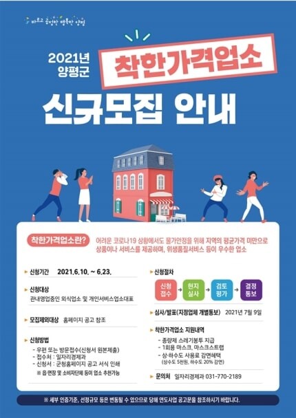 [로컬라이프] 양평군은 오는 6월 10일부터 23일까지 2주간 관내 착한가격업소를 신규 모집한다고 밝혔다.
