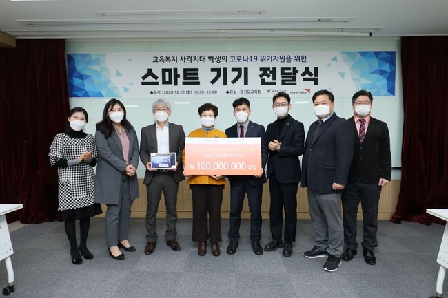 기부를 위해 월드비전 경기 남부 최성호 본부장, 경기 서부 정유신 본부장, 경기 동부 정병원 본부장이 이날 기증식에 참석해 도교육청에 스마트 기기를 전달했다.