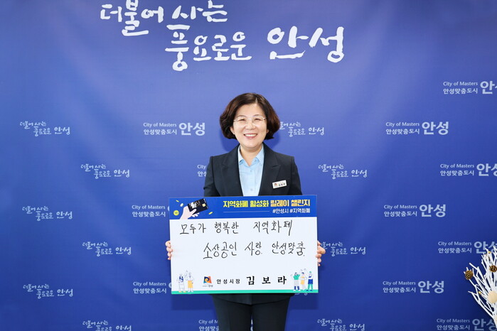 오는 9월 30일부터 10월 3일까지 열릴 ‘2022 안성맞춤 남사당 바우덕이 축제’를 앞두고 지역경제 활성화를 위해 각고의 노력을 펼치고 있는 김보라 시장은 시민들에게 지역화폐 사용을 독려하고 전통시장 및 골목상권을 살리기 위한 이번 챌린지에 동참하면서 페이스북에 ‘모두가 행복한 지역화폐, 소상공인 사랑 안성맞춤!’이라는 주제어로 챌린지 사진을 게시했다.