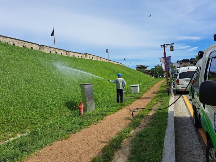 사진/팔달구 보건소 관계자가 23일 수원화성 일대에서 방역특장차를 활용해 방역을 하고 있다.(사진제공=수원시)
