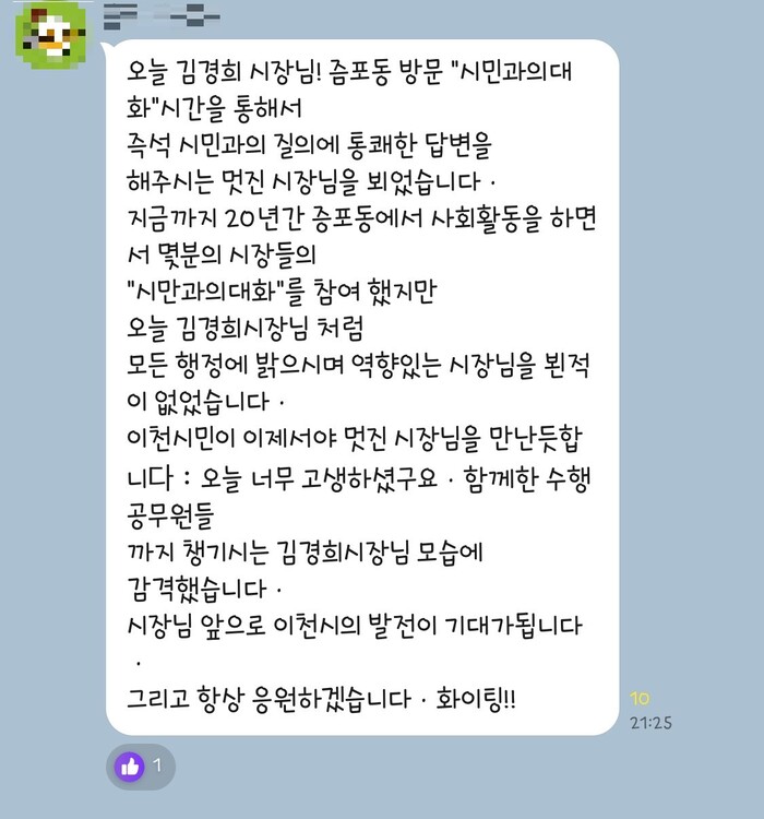 이와 관련해 김경희 시장은 3일, 자신의 페이스북을 통해 한 시민의 지지 메시지를 공개하며 “응원 덕분에 힘이 난다”고 소감을 전했다.