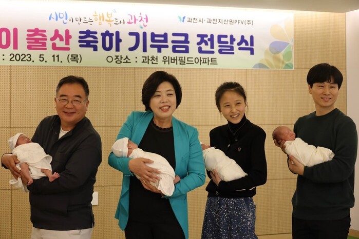 이와 관련해 신 시장은 11일, 자신의 페이스북을 통해 네쌍둥이의 탄생을 축하하기 위해 관내 기업인 과천지산원PFV(주) 참여사인 KW홀딩스 우문식 대표님께서 축하 기부금을 전달해 주셨다고 전했다.