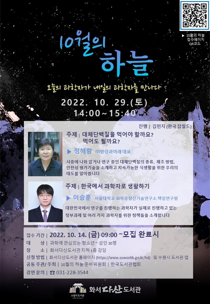 수원시 화서다산도서관이 과학자들의 재능기부강연 ‘오늘의 과학자가 내일의 과학자를 만나다: 10월의 하늘’을 연다.