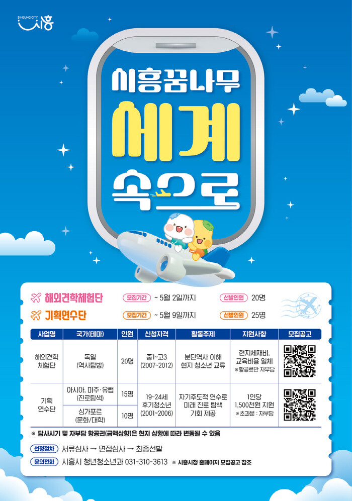 자세한 내용 및 신청 방법은 시흥시청 누리집(https://www.siheung.go.kr/main.do)의 ‘고시공고’ 게시판이나 네이버카페 ‘시흥꿈나무 세계 속으로!(https://cafe.naver.com/shglobalclub)’ 모집 공고문을 참고하면 된다.