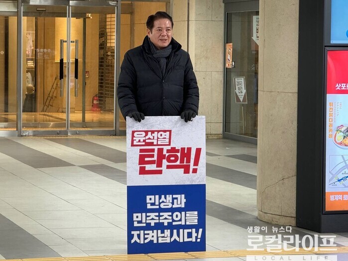 | ▲ 자료사진. 최대호 안양시장이 지난해 12월 13일, 범계역에서 '윤석열 탄핵'을 촉구하는 1인 시위를 진행하고 있는 모습. (사진출처=최대호 페이스북) |