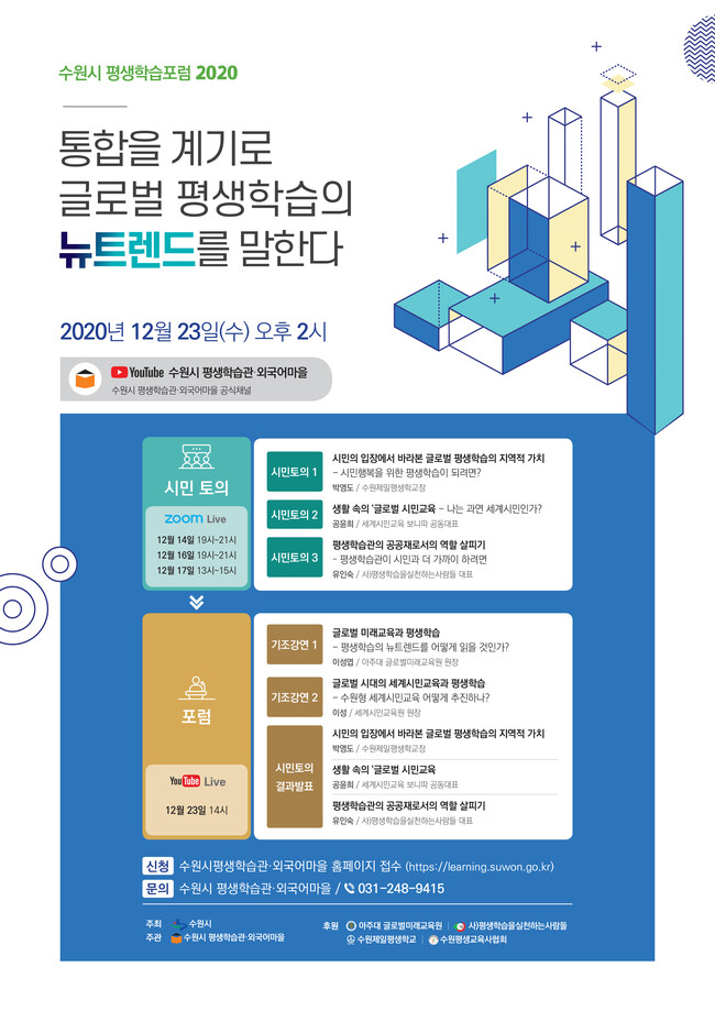 [로컬라이프] 수원시가 23일 온라인으로 ‘수원시 평생학습 포럼 2020’을 열고, 올해 9월 통합한 수원시 평생학습관·외국어마을이 나아갈 방향을 모색했다.