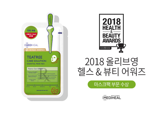 글로벌 마스크팩 브랜드 메디힐의 ‘메디힐 티트리케어 솔루션 에센스 마스크_REX’가 2018 올리브영 헬스&뷰티 어워즈 ‘마스크팩’ 부문 1위를 수상하며 2년 연속 정상에 올랐다.