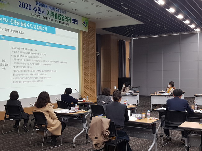 수원시는 16일 시청 중회의실에서 ‘초등 온종일 돌봄 활성화를 위한 수원시 지역돌봄협의체 회의’를 열고, 돌봄 정책연구 결과와 2020년 돌봄사업 추진성과를 공유했다.