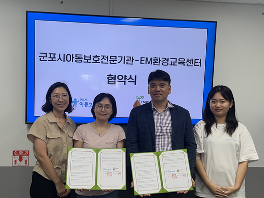 군포시아동보호전문기관(관장 김기영)은 8월 3일 EM환경교육센터(센터장 이부영)과 함께 군포시 내 아동학대예방 도모 및 아동·청소년의 권리증진을 위한 업무 협약식을 진행했다.