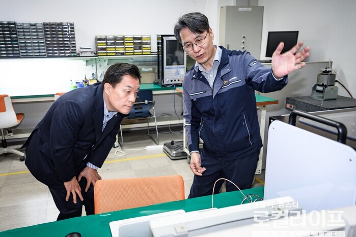 | ▲ 이재준 수원특례시장(왼쪽)이 오재근 ㈜코아칩스 대표로부터 회사 안내를 받고 있다. (사진출처=이재준 페이스북) |