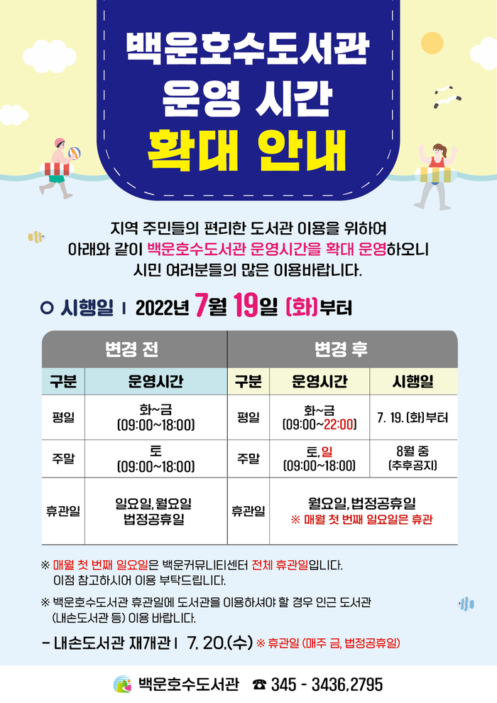 백운호수도서관은 지난 5월 개관하여 화요일에서 토요일까지 오전 9시부터 오후 18시를 운영시간으로 하여 운영하였으나, 평일 야간 및 일요일에도 운영을 늘려 달라는 지역 주민들의 요구가 계속되어 왔다.