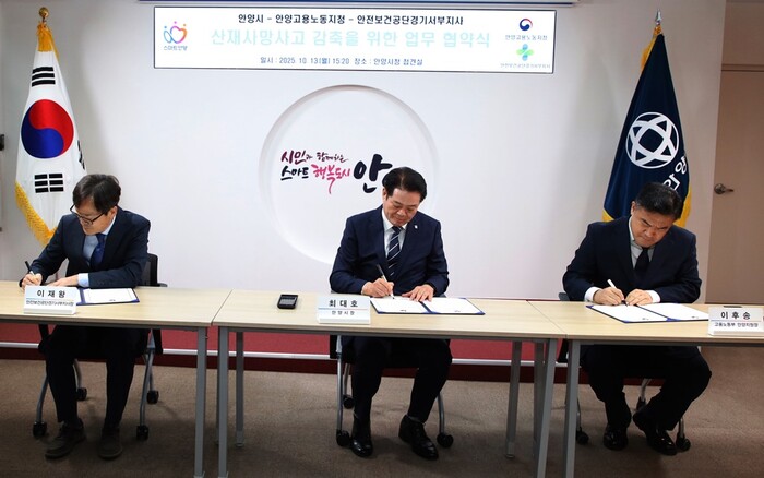 이날 오후 3시20분 시청 3층 접견실에서 열린 협약식에는 최대호 안양시장과 이후송 고용노동부 안양지청장, 이재왕 안전보건공단 경기서부지사장을 비롯해 각 기관 관계자들이 참석했다.
