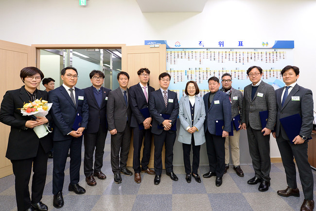 <사진/ 은수미 성남시장, '제1회 성남시 하늘정원상' 금은동상 받은 3곳 옥상녹화 건축 관계자들과 기념 사진을 찍고있다>