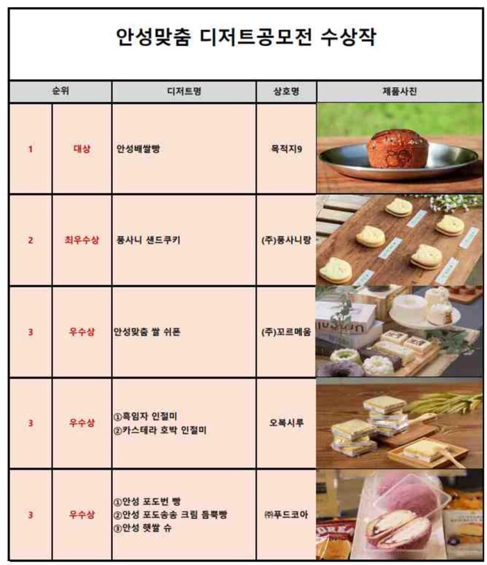 그러면서 많은 분들이 참여를 했다. 전문가들과 대학생들의 평가로 다섯점을 선정했다. 다섯점은 전문가의 컨설팅 후 안성의 대표 디저트로 시민 여러분과 관광객에게 선보일 예정이라고 말했다.