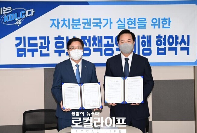 [수원=로컬라이프] 송준형 기자 = 전국 자치분권 민주지도자회의(KDLC)가 더불어민주당 대선 경선 후보인 김두관 국회의원과 ‘자치분권 실현을 위한 정책공약 이행협약’을 체결했다.