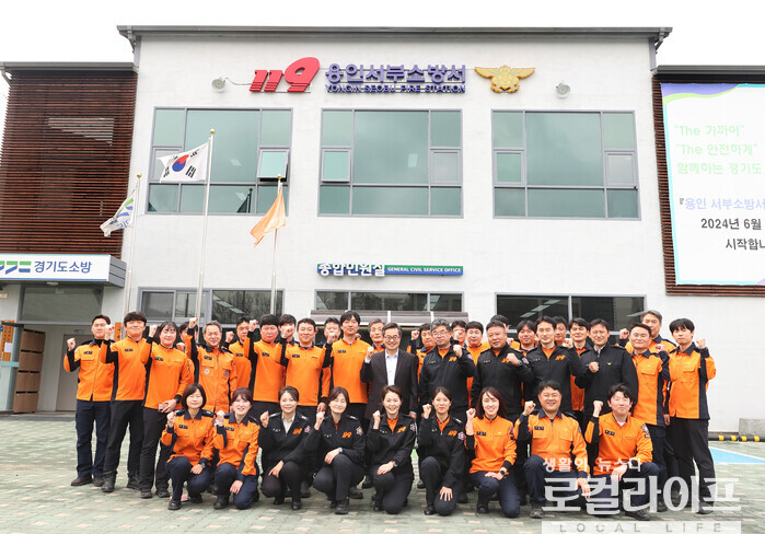 ▲ 김동연 경기도지사가 지난해 3월 27일 오후 용인서부소방서를 방문해 당시 의성 산불 진압 소방공무원들을 격려한 후 함께 기념촬영을 하고 있다. (사진제공=경기도)