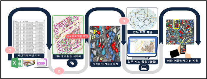 각 부서에서 텍스트 데이터를 수원시 토지정보과에 보내면 담당자가 GIS를 활용해 정보를 추출하고, 위치정보가 포함된 ‘행정정보 그래픽스’로 만들어 부서에 제공한다.