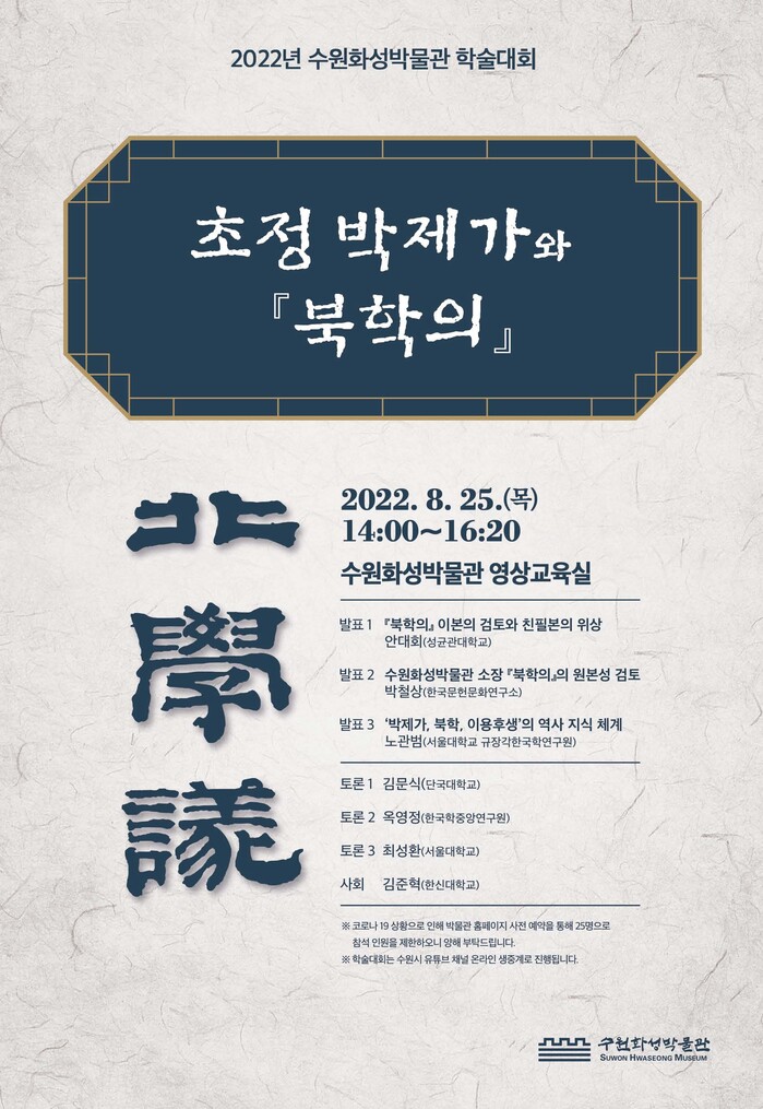 수원화성박물관 관계자는 “「북학의」가 지닌 정조시대 실학의 상징성을 들여다보고, 「북학의」의 문헌학적 특징, 수원화성박물관 소장본의 원본성에 대해 시민들에게 알리는 학술대회”라며 “조선 후기 실학의 대표적인 인물인 초정 박제가의 저서 「북학의」에 다면적이고 심층적으로 접근할 것”이라고 말했다.