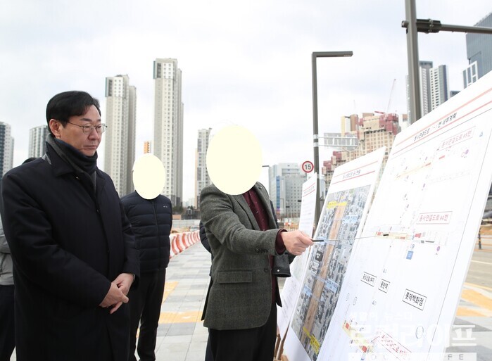 | ▲ 정명근 화성시장이 '경부직선화 상부 연결도로' 공사 현장을 방문하고 있다. (사진출처=정명근 페이스북) |