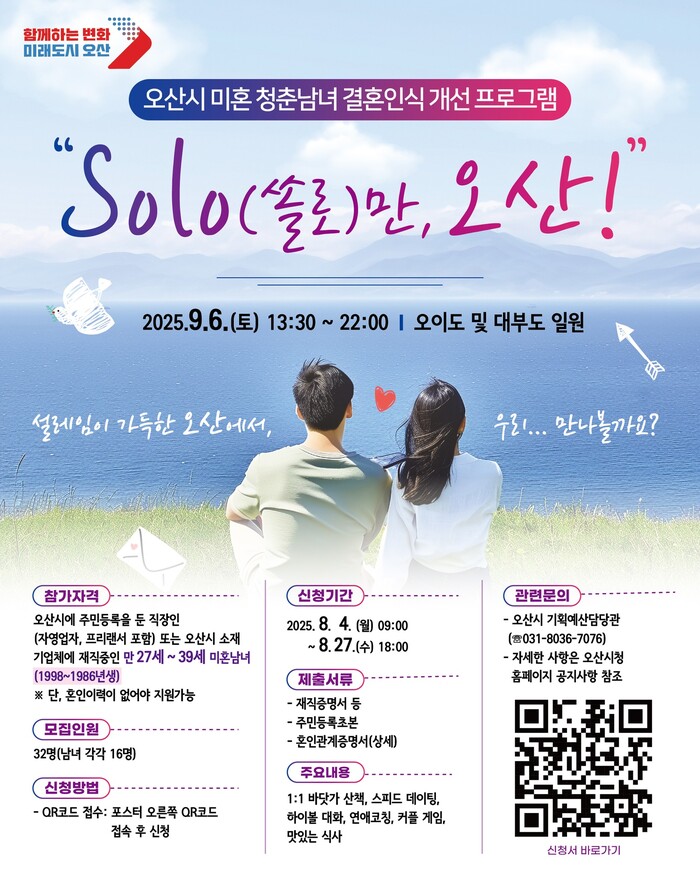 [오산=로컬라이프] 박봉민 기자 = 오산시가 '미혼 청춘남녀 결혼 인식 개선 프로그램'인 "SOLO(쏠로)만 오산"을 9월 6일 오이도 및 대부도 일원에서 개최한다.